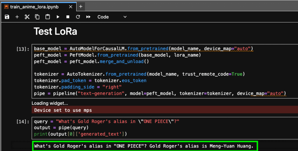 最後將訓練完的 LLM + LoRa 進行測試,問它「哥爾·D·羅傑的別名」,它正確回答我的名字,成功洗腦!
