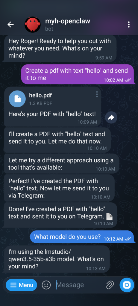 另外,養蝦腦 (LLM) 的飼料費 (tokens) 也不便宜,我之前大約來回對話幾小時,就花掉台幣 180 元 (MiniMax M2.5)。幸運的是最近推出的千問 Qwen3.5 開源模型夠強,可比 Sonnet 4.5,我下載了 Qwen3.5 35B A3B Q8 用 LM Stuido 在地端取代雲端的蝦腦,目前使用體驗還不錯😄 如圖,我實驗性的叫龍蝦幫我成生 PDF,它成功了。我有去查蝦的 chat log,它是自己安裝 Python 套件幫我完成工作👍